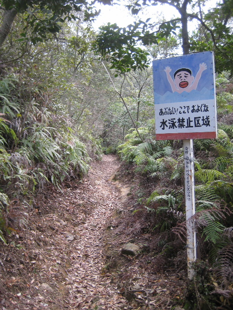 水泳禁止区域を知らせる標示板だった。もっとも現在いる山道からは周囲を見回しても池らしきものは見えない。池から流れ出る小川のせせらぎが聞こえるだけである。
