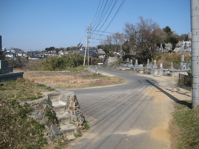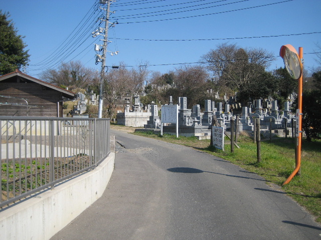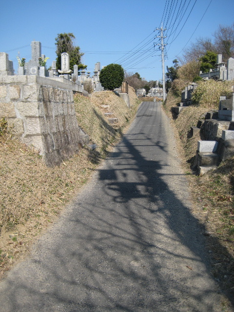 市道は緩やかに登り坂を進み、右側に夥しい墓石が見え始める。