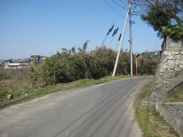 この区間は軽四でも離合できない狭さだ。そのためか車はここを通らず専ら広い地区道の方を通っている。緩やかな坂を真っ直ぐ登った先が小さな峠のようになっていて、その先に地区道との合流点がある。