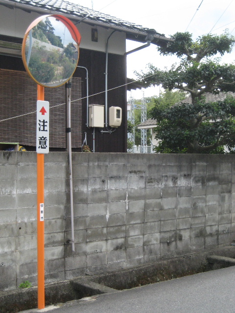 この狭い分岐路に入る車が利用するカーブミラーだ。支柱に宇部市のステッカーが貼られている。