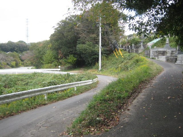 右側の登っていく道は市道了善河内線で、別の場所に同じく登っていく道がある。最高地点でUターンしてここへ戻ってくる墓参道路線だ。