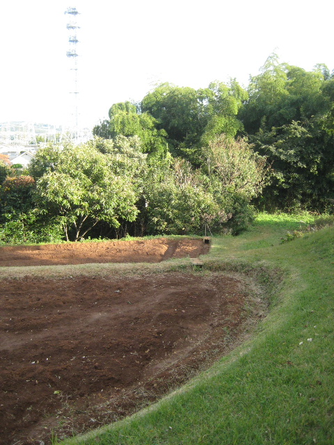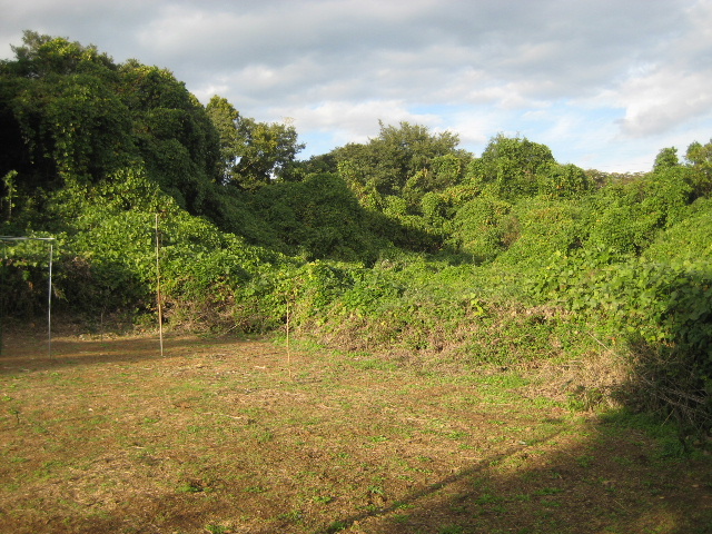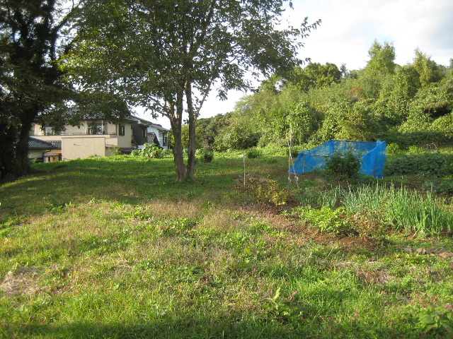 長方形状の畑地には防鳥ネットや農機具などが置かれており、その一番奥は利用されていない空き地で終わっていた。その先は壮大な藪だ。