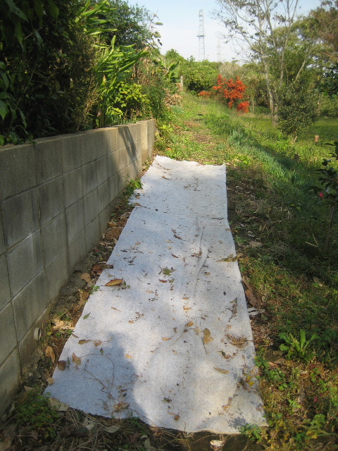 養生マットを敷いた場所や先方の緋色に目立つピラカンサもそのままだった。