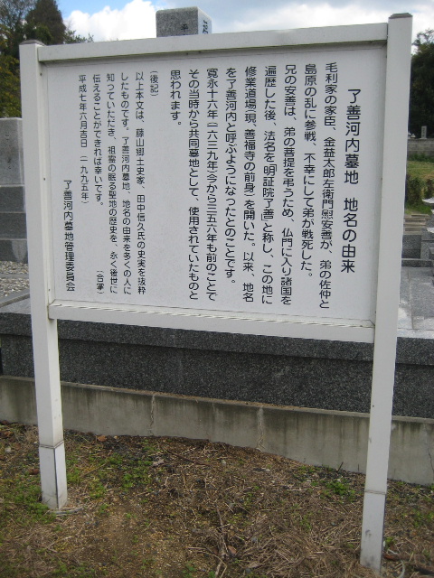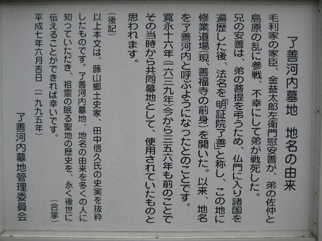 栄ヶ迫溜め池の南側にある丘陵地帯は了善河内墓地と呼ばれている。この変わった名前の由来は、了善河内墓地の墓参道に建てられた説明板に書かれている。