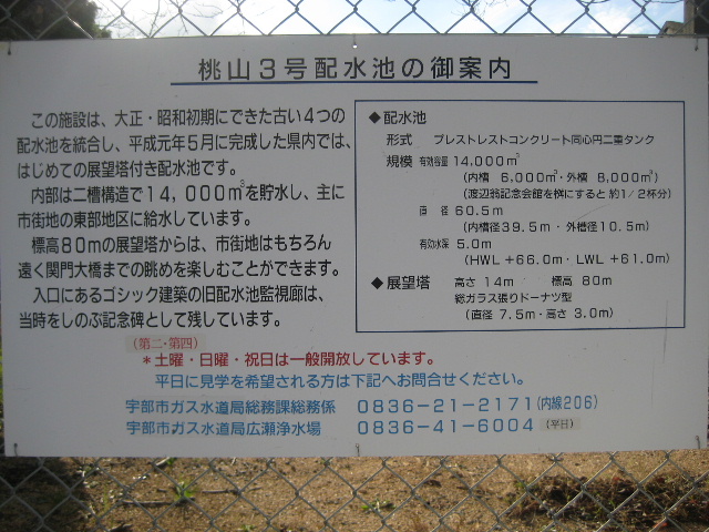 1.(2015/3/5追記)現時点では土日・祝祭日の午前9時〜午後4時はフェンス門扉が開放され、地元在住民が管理区域内に設置された管理室に常駐している。申し出れば3号配水塔の展望台の鍵を借りることで見学可能となる。詳しくは「桃山配水池|見学について」を参照されたい。