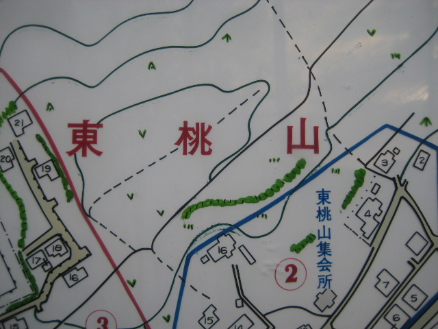 「東桃山」の赤字で”山”の字の上に描かれた細い黒線が市道藤曲門前線で、南北に交わる破線が市道崩金山線である。