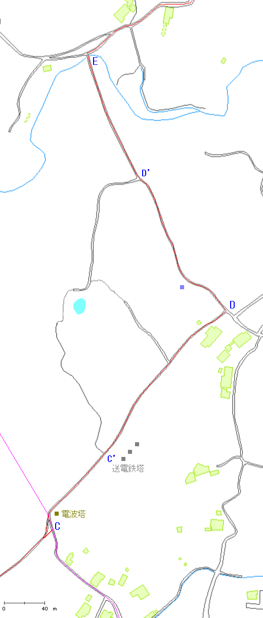 その道も国土地理院の最大拡大モード地図で記載されていた。C'地点からD'地点までの道であろう。確かに途中には小さな溜め池の堰堤を横切る場所があったからだ。