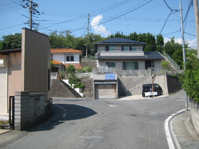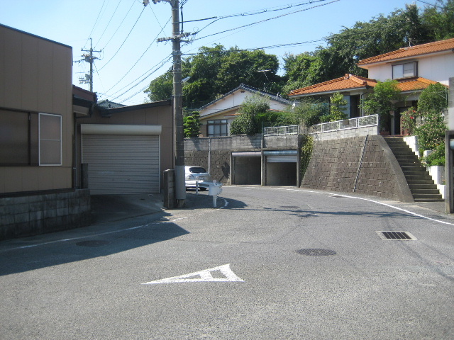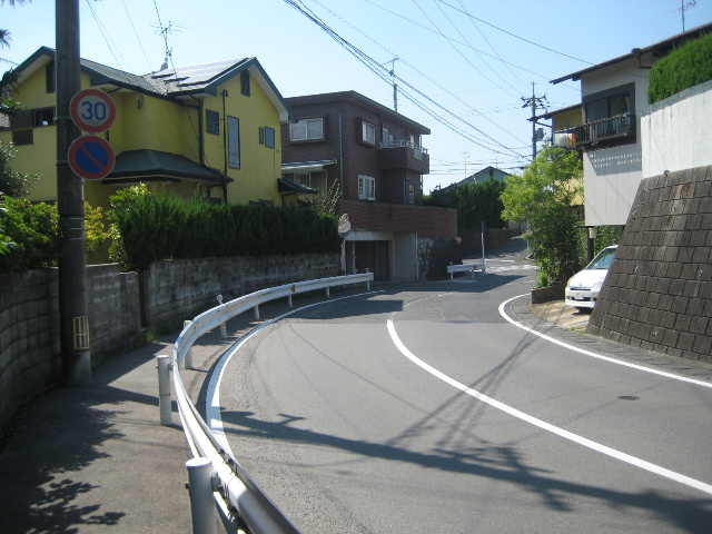 航空映像では本路線の西側にかなりの幅と深さがある沢地が存在し溜め池も見えている。小字絵図ではこの辺りに惣田ヶ迫という地名が与えられている。現在住宅地となっている部分は本路線の高さに近づくまで沢地を埋めた結果のようである。実際、現在もなお本路線よりも住宅地の方が若干低い。本路線のカーブ部分から下の沢地を盛土によって地上げし、更に住宅地で埋め尽くされたために周囲の地勢が見えづらくなっている。大幅な地勢改変があった後も住宅地になる以前からあった連続カーブが線形改良されることなく取り残されてしまったのである。(2016/11/21)