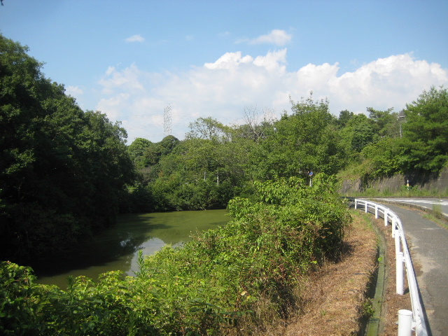 道の左側は沢になっていて、溜め池になっている。峠を越えて下る側に家が見当たらない一つの理由だ