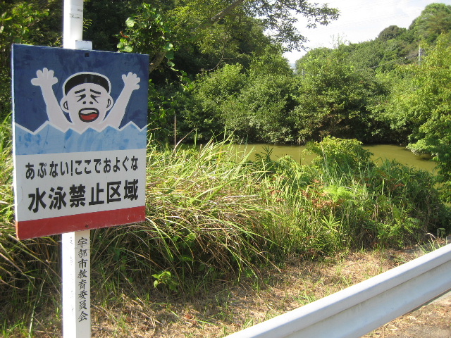 市内の溜め池全般に当てはまることだが、ここも水泳禁止区域を示すお馴染みの立て札が設置されている。