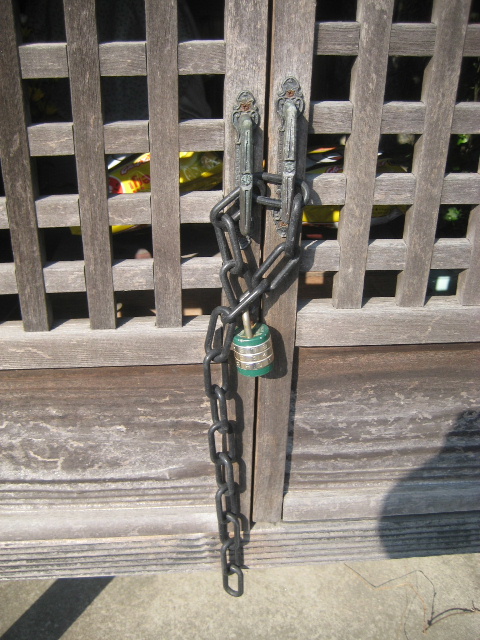 一般の寺社なら開いて拝む部分の扉が施錠されているなんてことは普通有り得ない。しかし藤山八十八箇所の御堂は元々が私有物であり、設置場所も完全に民地の中に存在するものも多い。公道に面した部分に置かれている祠でも看ていらっしゃるのは一個人であり、行政が補助金を出しているわけではない。すべて個人の自己負担である。あくまでも管理する方の好意によって「見せて頂いている」わけで、地域の財産である寺院とは成り立ちが異なる。扉が施錠されていて中を眺めることができなくとも批判はできない。特にこの場所は交通量の多い道路に面しているので、施錠されたのは中を開いてイタズラするなどの行為が目立ったかも知れない。