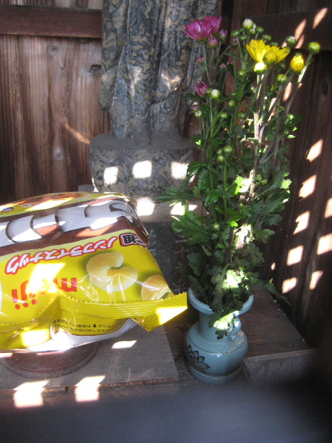 カメラのレンズを右の方へ寄せて再度撮影。お菓子がお供えしてあった。