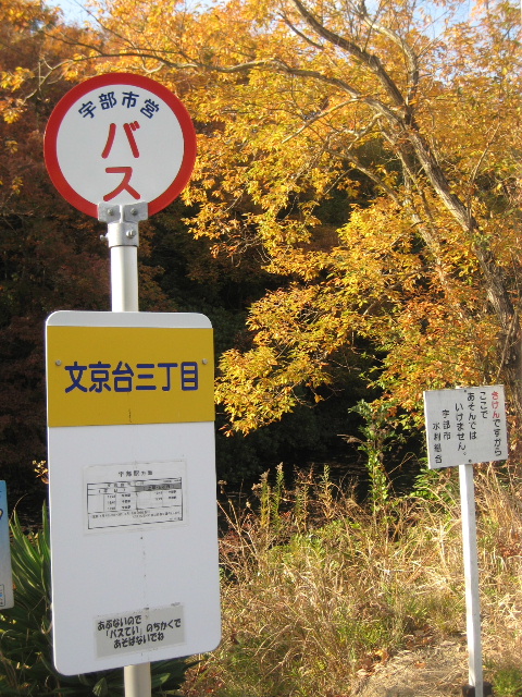 再び現在の写真に戻って、文京台三丁目バス停サインの下側には「あぶないのでバス停近くで遊ばないように」の注意書きが出ている。