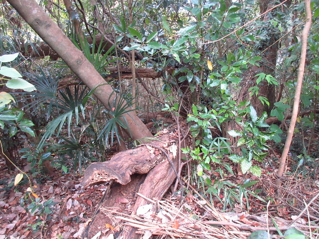 概ね最高地点に到達したところで、見かけの道は送電鉄塔のある右の方へ曲がっている。これは後年鉄塔の管理道として整備されたものであり本路線の経路ではない。藪の中へ突っ込む形で直進する経路をたどっている。この入口部分は日当たりが良く草木が伸びているため完全に隠れていて特定困難である。この藪を突っ切ればその先に踏み跡が現れる。概ね大八車を牽き通せる程度の幅の道で、かなりの勾配で下っている。道の痕跡はかなり明瞭で、一定勾配に地山を掘り下げた痕跡がみられる。深い堀割となっている区間には両側から枯れた竹が倒れかかっている。