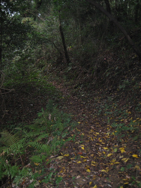 「(道を指して)この先を越えて行くと、一軒家があって道がカーブしちょる所がある。その内側が大きな窪地になっちょる。そこが掘った跡だと親父から聞いたことがある。 窪地は今もあるとは思うが、竹が生えてもう分からんよぅになっとるかも知れんのう。」