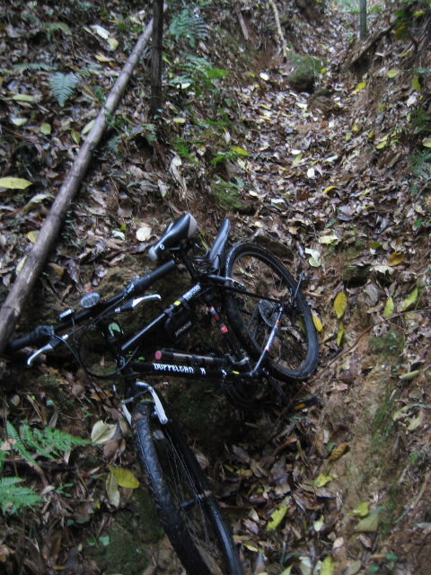 「担がないと通れない場所があるかも知れない」の忠告通りだった。元から乗って進めるような道ではなかったが、人の通らなくなった山道は急速に荒れ始めるらしくやがて自転車の押し歩きですら困難になってきた。