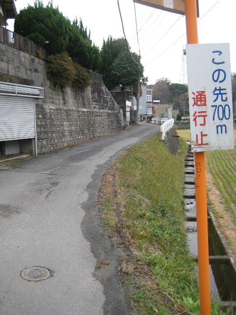 700m先へ進んだところで通行止めという表示が出ている。表示板は薄汚れているので、ずっと前からこの状態らしい…