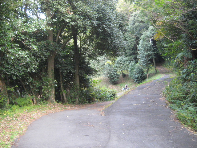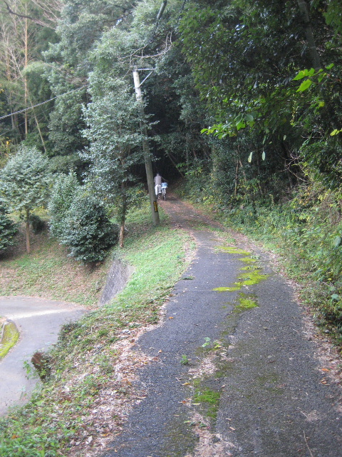 下っていく道は沢をなぞるようにうねっていてかなりの勾配である。その通行人は自転車を押し歩きで登っていた。私の撮影位置からでは一旦カーブの内側に消えた。