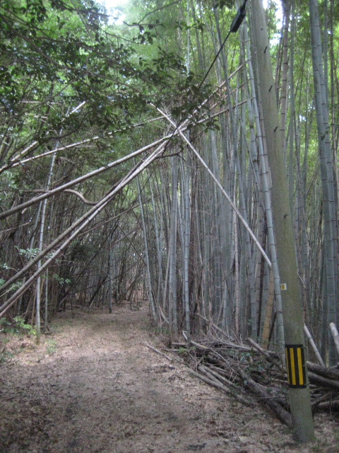 数本の枯れ竹が倒れかかって電話線らしきコードの上に乗っていた。