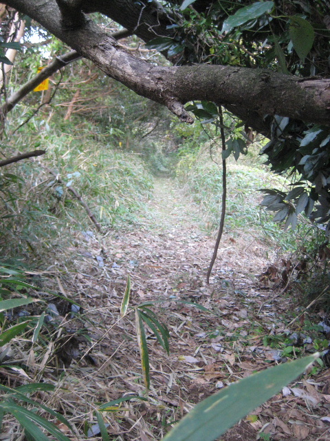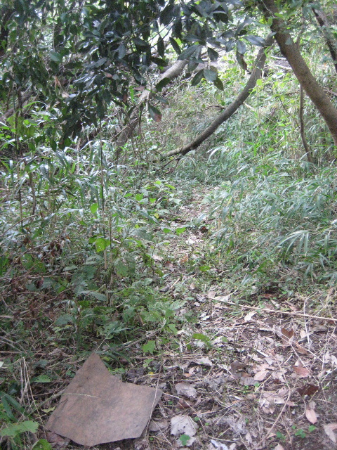 坂を下る途中、コンクリート電柱が建っている脇につい最近確認された古道の分岐点が存在する。