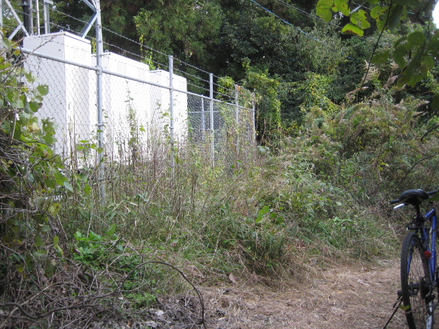 携帯電波塔関連の施設を横に見て坂を下り始める。ここは勾配がきついので自転車は当然押し歩きだ。