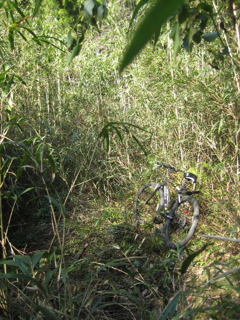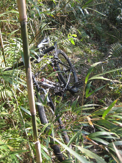自転車は野山時代に買ったもので、元々山道を走ることが多いだろうからと思い、クロスバイクながらマウンテンバイク並みにタイヤの太い仕様である。そのため抱えると何とも重い。更に笹藪が進攻を妨害する。あと少しだから…と腕ずくで強引に押し切った。