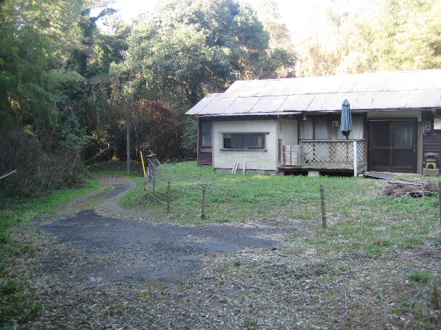 やや振り返り気味に撮影している。左側の小屋の横にぽっかり空いた穴のように見えるのが崩金山線の起点側、本路線はコンクリート電柱の右側だ。いずれもいいとこ勝負な酷い山道である。