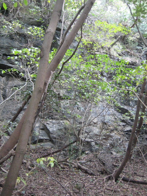 道と水路はここで緩やかにカーブしているのに対し、斜面はずっと退いていて山肌は露岩だった。初回トレース時は水路沿いに繁茂していた樹木や藪で見落としていたのだろう。