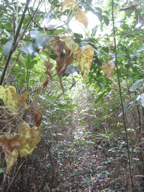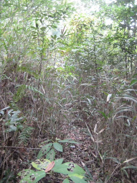 踏み跡は水路に沿って確かに続いていた。ちょっと日の射す場所は雑草が伸びるせいか踏み跡が淡くなった。