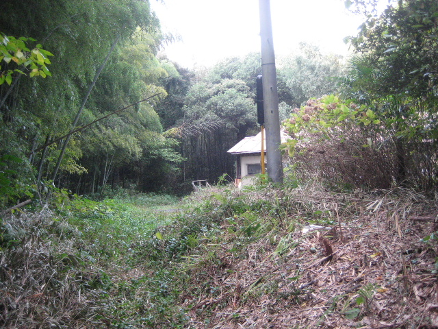 前方のコンクリート電柱のある場所が市道金山線の終点である。そこで右折(という感覚でもないのだが…)して崩金山線に復帰した。