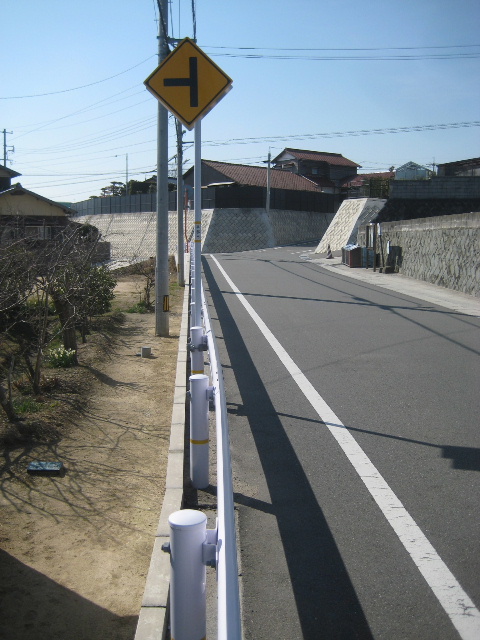 実際、この場所から途端に交通量が多くなる。特に工学部通りを通って県道を横切り、このT字路を左折して本路線に流入する車が極めて多い。