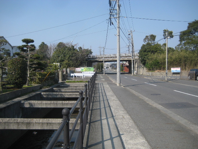 前方に国道190号との立体交差が見えている頃、左側から深い水路が本路線に接するようになる。