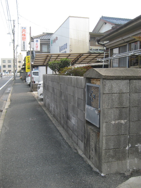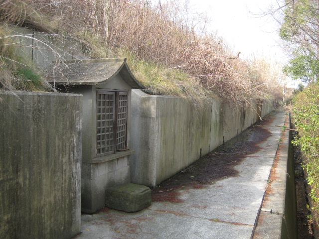 この祠は2方向を民家のコンクリート塀に囲まれている。元々祠があったところに合わせて建築ブロックを築いたようだ。