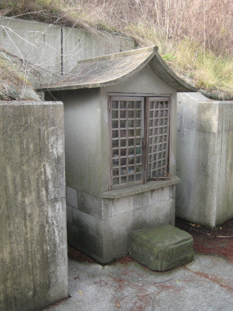 台座や屋根部分はコンクリート製で、鋼板の扉が設置されていた。雨風を凌ぐためか簾がかかっている。