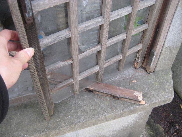 この祠は状態が良くなかった。引き戸はガラス嵌め込みで、桟の部分が一部取れてしまい開閉できない状態だった。