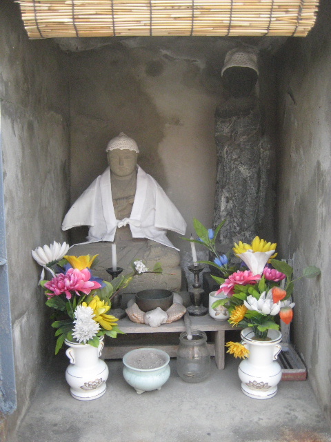 造花が活けられローソクも設置されている。近くに看る方がいらっしゃるようだ。