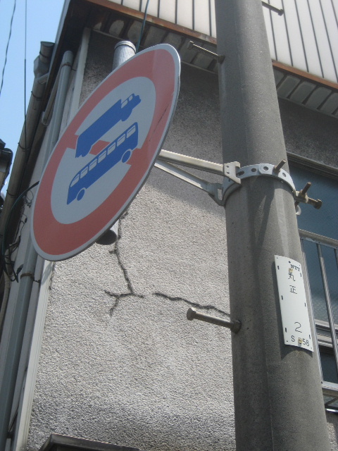 電信柱のプレートと言えば、本路線の終点側から入ったとき左側に位置する電柱にも今では意味がよく分からない情報を見つけた。本路線の終点側からみて大型車両通行不可の表示板が取り付けられている電信柱である。