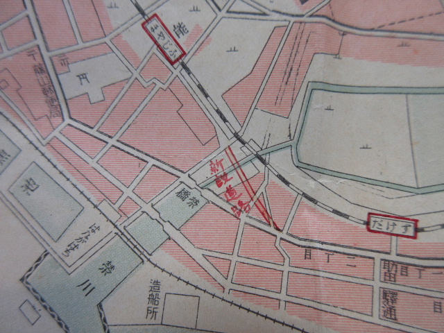 地図に赤ペンで宇部鐵道の助田駅・藤山駅が囲まれ、市道上町線から市道東汐土手線までの区間が新設道路と描かれている。翌年昭和12年の宇部市街図にはこの道路が描かれていることから、この区間が昭和11年頃に造られたことが分かる。なお、上の地図で横切っている細い道は、現在も車両が通行できない路地(市道助田小路2号線)として遺っている。