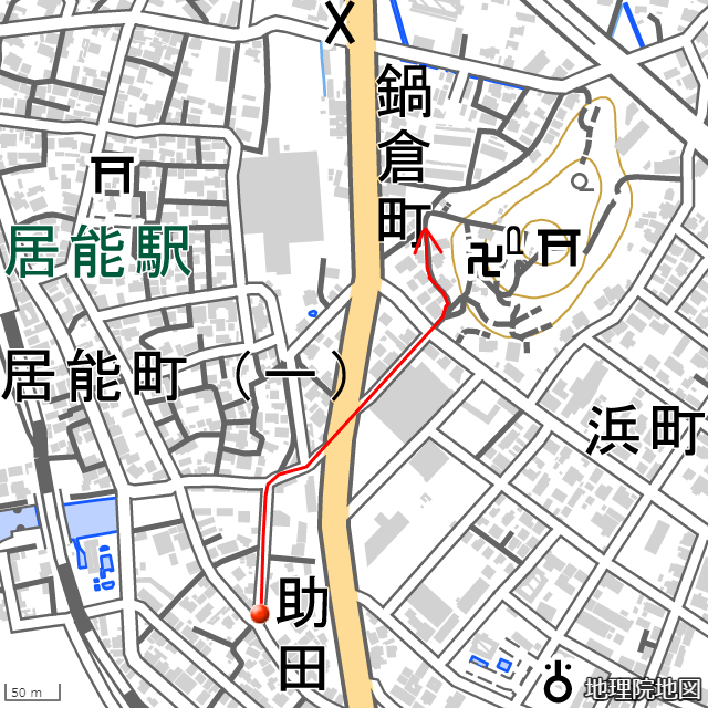現在の経路を地理院地図に重ね描きした画像を示す。●は起点、矢印は終点を表している。