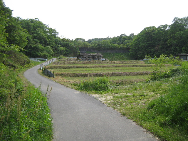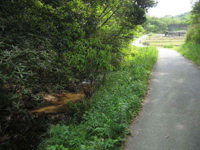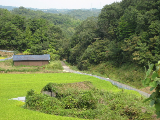 この滝を過ぎると小川は再び緩やかな流れを取り戻し、市道の縦断勾配も穏やかになる。その先で再び沢が二叉に分かれ、いずれも田畑が広がっている。農作業に必要な資材を保管する小屋が散在している。