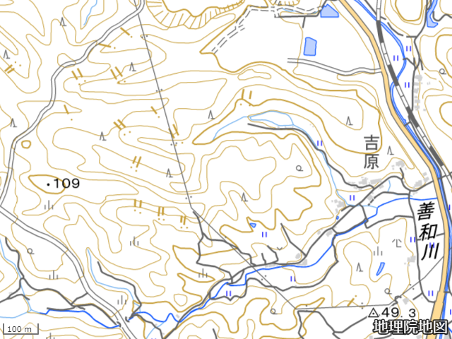 しっかり踏み固められた未舗装路ならまだしも、元からこの区間は適当に草が生えただけの真砂土の道だ。真砂土は水はけが良い半面、雨などによる浸食を起こしやすい。これは国土地理院地図による吉原近辺の地図である。