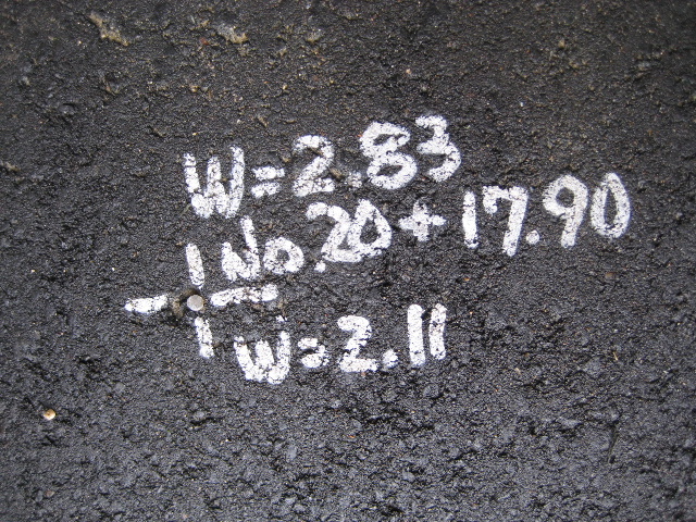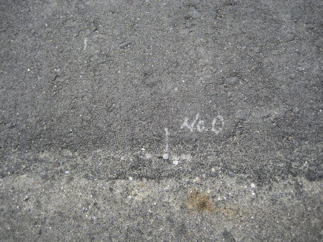 入口部分に No.20+17.90 というマーキングが観られる。測点は20m毎に設置されるので、ここまでの舗装の施工延長が417.90mだったということが判明する。