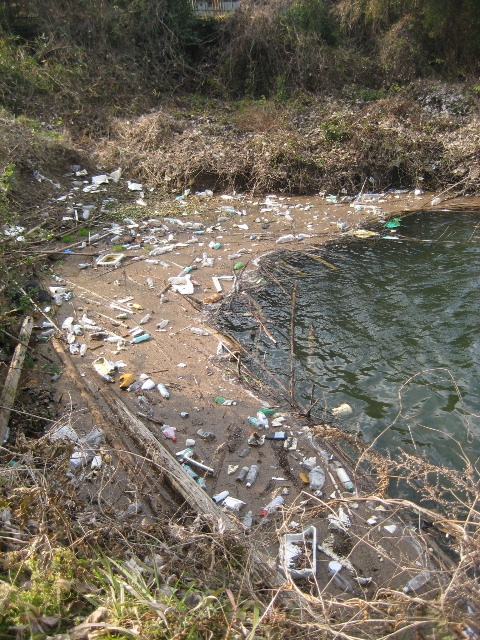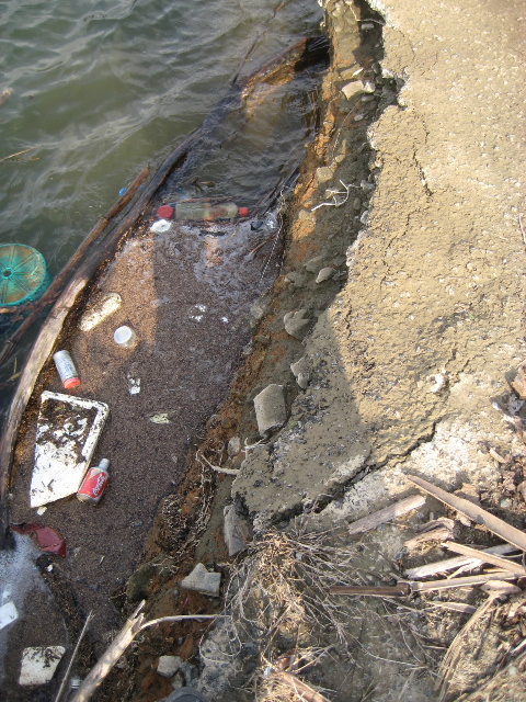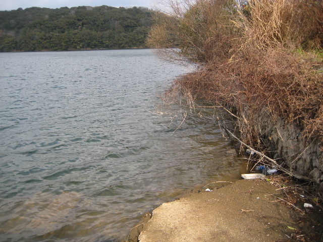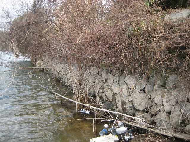 こんな感じで入り江部分は風が吹き寄せるせいでゴミが酷い。先に訪れた左岸曝気循環設備棟の入り江でも同様だった。