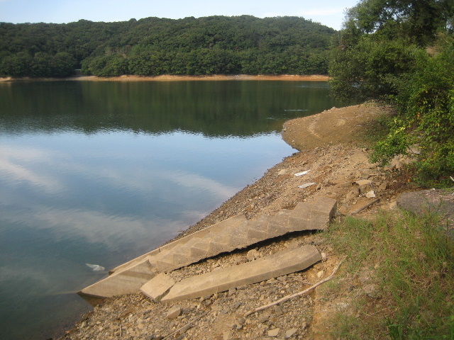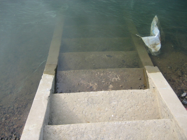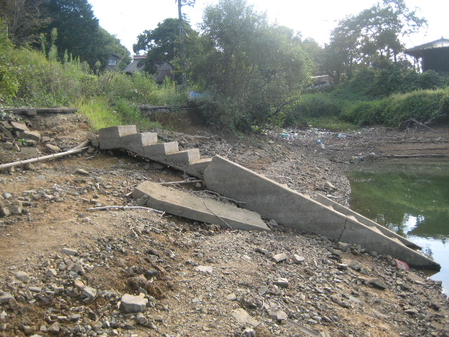 初めて来たときチラリと見えかけていた通り、市道の路肩が大きく崩れている部分の先端から直角方向に湖底へ降りるコンクリート階段があった。