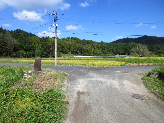 市道下小野平原市小野線はこのまま北上していく。この石碑が据えられている三差路で右折し山の中へ分け入る市道が目的のものだ。