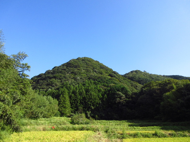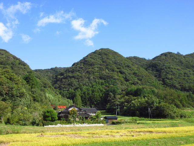前方に秀麗な形をした山々、実った稲穂の田んぼ、そして茶色い瓦の目立つ民家が散らばっている。典型的な里山の風景だ。