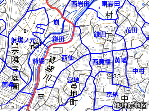 起点からスタートして真締川を渡る経路と言えば一本しかない。一つ下流側に新橋という不思議な名前の橋を渡る市道西の宮線があり、形態が似ている。しかし市道西の宮線は橋が起点になるのに対し、本路線は何故か逆に橋を渡って終点となる。