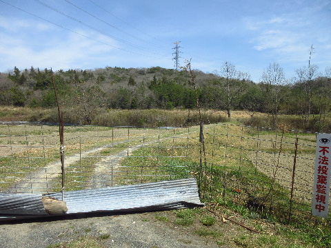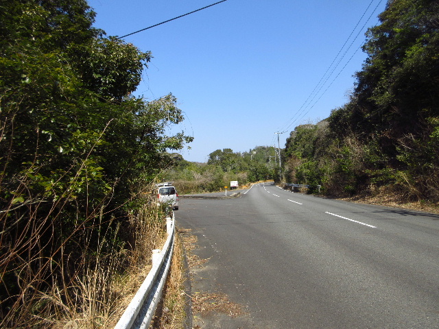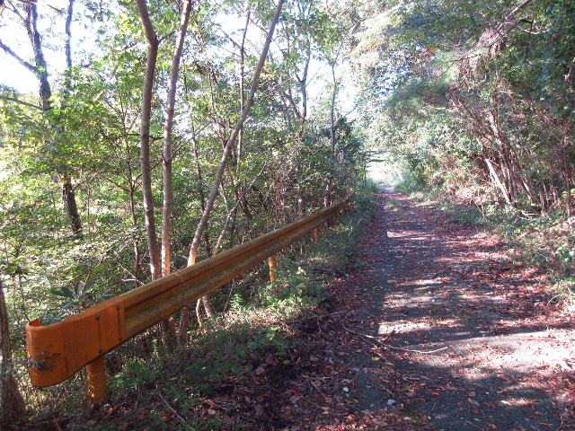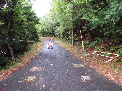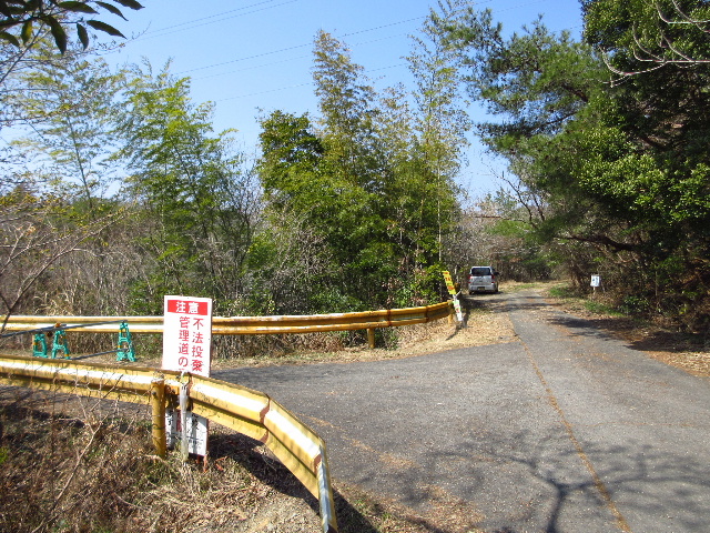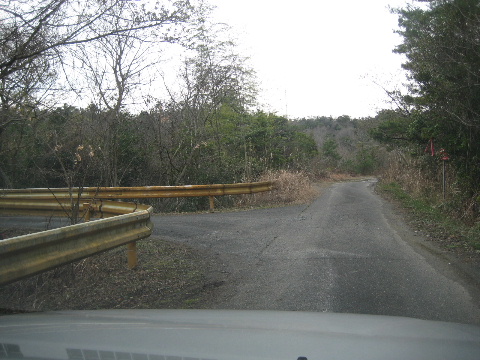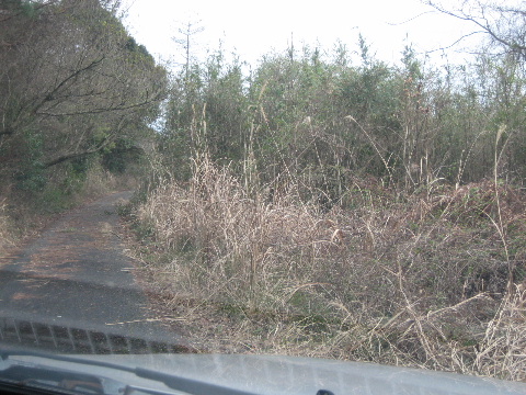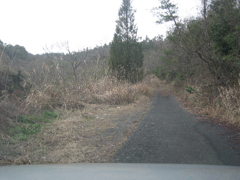 これより直進するとアスファルト路は途端に荒れ始める。路肩の舗装部が割れていて、最初に舗装したときの状態のままと思われる。なお、この先は常時水気の溜まったぬかるみ道であり、軽四でも方向転回が困難である。不用意に進行しないことを勧める。