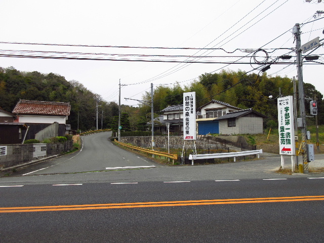 丸山ダムの表示板がある国道2号の押しボタン式信号機の分岐点に起点がある。ここより直角に曲がって坂を登っていく方が本路線である。写真は国道2号の反対側からの撮影。