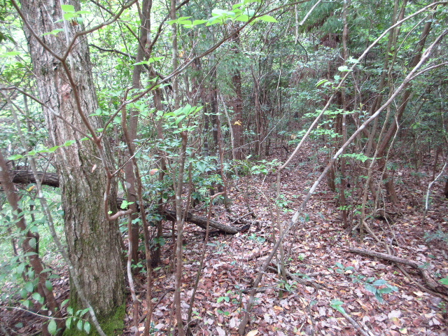 これより先は本路線がどの方向に進んでいるかも解析できていなかった。防空壕の前は十字路になっていて、直進すると沼田ヶ原に抜ける山道だが過去に数回誤って本路線から外れて進行していた。右側の道は地図上では道々池の縁を通って県道小野木田線に到達する経路のようである。本路線はこの場所でほぼ直角に左へ折れる。防空壕の手前まで左側にコンクリートの水路が続いていて、これと同じ形式の水路に沿って進むのが本路線の経路である。